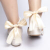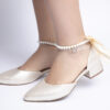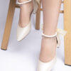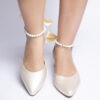 Zapato de tacón bajo con punta cerrada y diseño elegante, ideal para ocasiones especiales. Está confeccionado en un material satinado en tono marfil, lo que le da un acabado sofisticado y delicado. Destaca por su distintiva correa en el tobillo, adornada con perlas y un sutil broche dorado, brindando un aire refinado y femenino. Además, incorpora un lazo de satén en la parte trasera, añadiendo un toque romántico y distinguido. Perfecto para novias, invitadas o cualquier look elegante que requiera un calzado cómodo y estilizado.