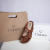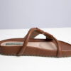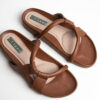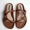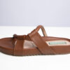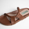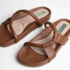 Sandalias tipo mule o slip-on. Abiertas en la parte trasera sin hebillas ni cierres. Cuero o imitación de cuero en color marrón. Dos correas gruesas y un diseño con refuerzo en la parte delantera para mayor sujeción. Plantilla acolchonada que brinda confort al caminar.