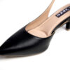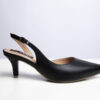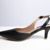 Este modelo es un zapato slingback de punta fina y tacón bajo, ideal para un look sofisticado y versátil. Está confeccionado en un material negro de acabado liso, lo que le da un aire elegante y atemporal. Su diseño destalonado con una fina correa proporciona un ajuste cómodo y estilizado. El tacón delgado y de altura media aporta un toque de refinamiento sin sacrificar la comodidad. Perfecto para combinar con outfits formales o de oficina, así como para elevar un look casual con un toque de clase.